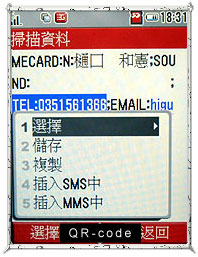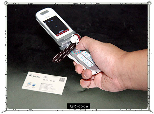 QR-Code 可用來做很多事情,首先我們先看看日本人最常用到的功能 - 以 QR-Code 掃瞄名片。在日本很多的名片上都有 QR-Code,透過手機來掃描解碼,可以讀取到名片上的資訊,不用費功夫的一一用按鍵來輸入文字,即可儲存個人的詳細資料,效率大為提高!