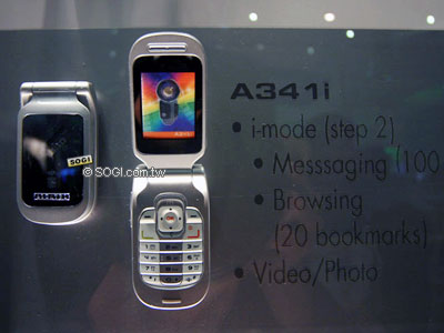 A341i 是專為 i-mode 設計的手機產品,其可存 20 個我的最愛以及最高 100 KB 的訊息傳輸,並可拍攝靜態及動態影片。外型設計則非常前衛,外螢幕是斜著放的...