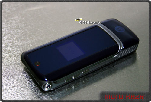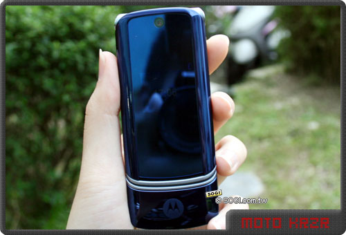 KRZR 在外型上正面完全是鏡面處理,湛藍的配色使得手機呈現相當典雅的氣質。雖然可常見反射出耀眼的光芒,卻也因為容易沾到指紋而令人困擾!較過去的 RZAR 相比,在寬度上可說是大幅縮減,只有 103 x 42 x 16 mm,與 V3 的 98 x 43 x 13.9 mm 相比,寬度足足少了 1 公分之多。 RZAR 系列過去被對手攻擊為「超薄的大胖子」,KRZR 可說是完全血恥了。