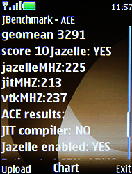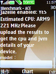 ARM 與 JBenchmark 合作開發的測試程式「ARM CPU Estimator(ACE)」,可測試手機的處理器與 Java 效能,以及 CPU 資訊以及圖表。測試的方法非常簡單,只要將 ACE 程式傳到手機或記憶卡當中,打開程式在手機上安裝即可。安裝完成後,打開 ACE 應用程式檔案並執行,即可就可以看到如 CPU Family、時脈與 Java 效能圖表等資訊。結果顯示,Nokia 6500 classic 屬於 ARM9 系列,執行時脈為 221MHz,支援 Jazelle 硬體 Java 加速。