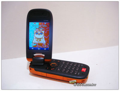903T 外螢幕搭載的是 1.1 吋的 TFCC 液晶,在顯示來電資訊以及一般情報上面很足夠,除了白色機型以外,其他兩色由黑色的本色搭配外圈的異色光芒,不自覺的炫目了旁人的眼。手機的吊飾孔配在機身的左上方,以免攝影的時候吊飾繩跑來插一腳。