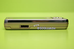 機身左側設置僅有一個 USB 插孔,可連接耳機、傳輸線、充電器與 TV-Out 連接線。左圖為插槽關閉,右圖則是插槽往左推開的情形。