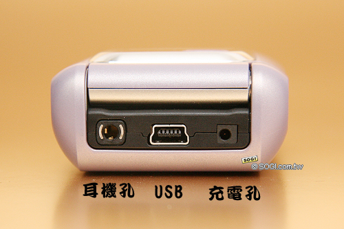 機身頂端則是 Nokia 6267 的其他插孔介面,如上圖,使用者可插入隨機附贈的 2.5mm 接頭耳機,也可直接插入一般的 USB 傳輸線,立即與電腦連線同步檔案。
