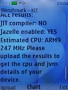 ARM 與 JBenchmark 合作開發的測試程式「ARM CPU Estimator(ACE)」,可測試手機的處理器與 Java 效能,以及 CPU 資訊以及圖表。測試的方法非常簡單,只要將 ACE 程式傳到手機或記憶卡當中,打開程式在手機上安裝即可。安裝完成後,打開 ACE 應用程式檔案並執行,即可就可以看到如 CPU Family、時脈與 Java 效能圖表等資訊。結果顯示,Nokia 6267 屬於 ARM9 系列,執行時脈為 247MHz,支援 Jazelle 硬體 Java 加速。