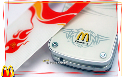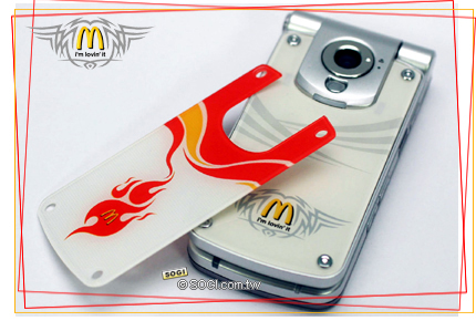 麥當勞速食對於七年及以上的學生消費族群來說,自然是再熟悉不過了;但是,自己專屬的貼身行動電話上頭,也有令人熟悉的 Logo,這可就不平常囉! 一個專屬英文字母「M」就代表著色香味拒全、不可抗拒的美味,現在讓消費者也可以隨身攜帶這專屬 Logo,不僅創意、噱頭十足,更讓人不禁蠢蠢欲動。