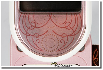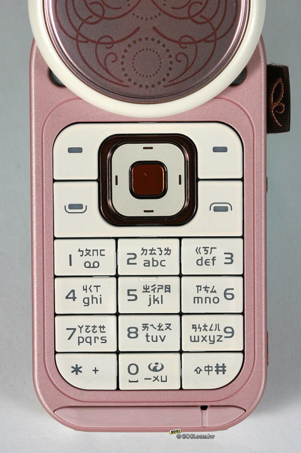 旋蓋後下方是大尺寸的按鍵區,乳白色設計讓粉彩紅機身有喘息的機會,帶來些許清爽感。按鍵均有中等偏大的尺寸,發送文字簡訊使用很順手,只要習慣諾基亞的注音位置,馬上變身簡訊閃靈打手。另外,五向鍵中央的選單按鍵採用琥珀色方塊造型,像是寶石鑲嵌在手機呢!下蓋左右兩側靠近上蓋的部分,各有一個圓形揚聲孔,音量不用擔心會被遮蔽。
