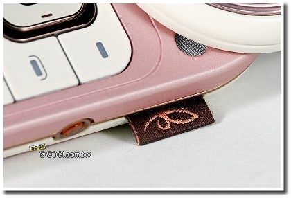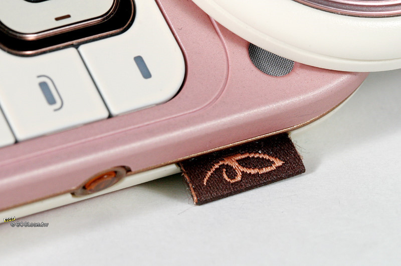 右側的操作快捷鍵也不多,靠近機身底部的是拍攝快捷鍵,未開蓋時也能快速進入拍攝介面,另外上方則為電源鍵。右邊還有 L’Amour 系列標示的布織標籤,2006 年首創將衣服標籤挪用於手機的設計,在 NOKIA 7373 身上也見得到唷!