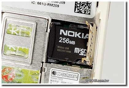 新一代的 NOKIA 7373 看似只有在時尚設計,圖騰變化創新,但除了 200 萬畫素相機比 7370 強悍之外,新增 microSD 記憶卡擴充,也讓音樂與照片的攜帶量大增。不過,記憶卡插槽位於電池下方,與 SIM 卡並列,當然無法熱插拔,置入跟取用時都會較為不便。