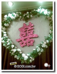 再拍攝婚禮中央的「囍」字,清晰度也算尚可,而且有把投射燈光照射的感覺表現出來,不過周邊花朵一樣有色彩不明顯的情況,就連平時大紅色的「囍」字也比較沒有那麼鮮豔了呢!