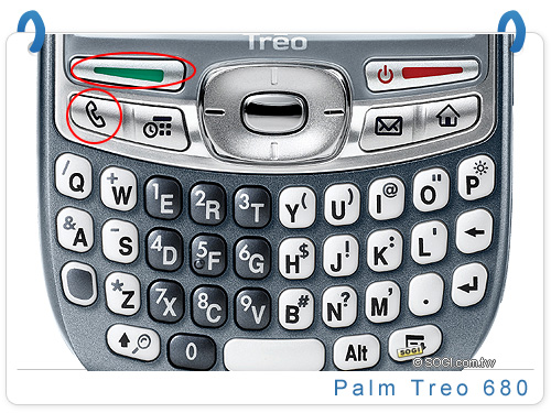此次 Palm Treo 680 將電話鍵分成二個不同的按鍵,Palm Treo 680 將 QWERTY 鍵盤上的電話鍵分成二個不同的按鍵,電話標誌按鍵的上面按鍵可用來打出電話、接聽來電,而電話標誌部份,變了進入電話模式介面捷鍵。Palm Treo 680 除了電話按鍵改變之外,在內建的電話功能上也大大的升級,新的電話介面,功能更加齊全。