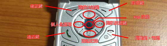 在按鍵方面,使用了五方向鍵,中間的按鍵是wap的快速鍵、上鍵是遊戲的快速鍵、下鍵是通話記錄的快速鍵、右鍵是簡訊的快速鍵、左鍵則是個人化選單的快速鍵,可以把你比較常用的項目新增到個人化選單裡面去,這樣子以後就不用找來找去就花了不少時間