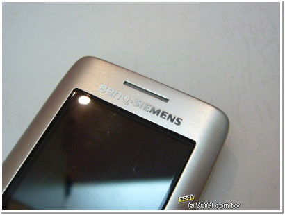 斗大的 BenQ-Siemens 雙品牌 Logo 就位於手機的正上方,利用浮凸的立體方式設計,無形中增加手機的辨識度。此外,在 Logo 上面的是長條狀的聽筒, S68 並無其他的喇叭孔裝置。