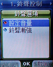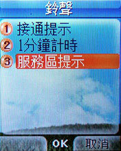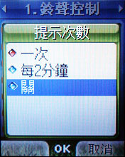 來電提示的方式,有僅鈴聲、僅震動、震動後鈴聲、閃燈四種,依照使用環境的差異來設定不同的提示方式。鈴聲的音量還能設定漸強,對於手機的基本使用禮儀來講,音量漸強是必要的功能之一。另外,通話的時候也能設定每分鐘計時,對於斤斤計較的手機通話族來講,是不可或缺的重要功能。