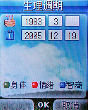 生理週期功能,只要輸入個人的出生年月日,輸入欲查詢的日期,就能查詢個人的身體、情緒、智商狀況,作為個人的參考資料。