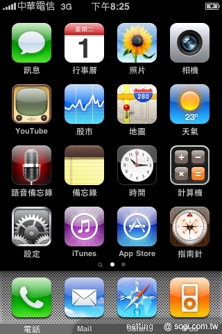 ▲Apple iPhone 3GS 的桌面 ( 借用圖片來源 : netting 大大的文章:順暢無比 iPhone 3GS任我行 )。