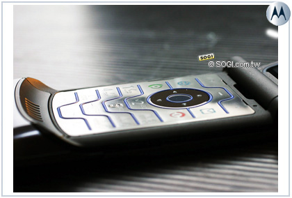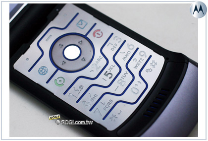 在掀蓋之後也能發現 Motorola V3i 工藝設計的美感,不同於 V3 在底座數字按鍵上,Motorola V3i 的底座採用了特殊的金屬蝕刻鍵盤及冷光效果,使得鍵盤變得更加璀璨奪目。