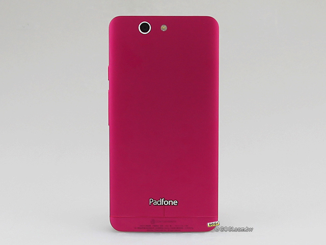 ▲ASUS PadFone Infinity 變形手機「魅力桃」機身後方為全桃紅色設計,但取消了「洗鍊灰」版本的髮絲紋路,手感非常光滑平整。下方的 PadFone Logo 同時也是 NFC 感應區。