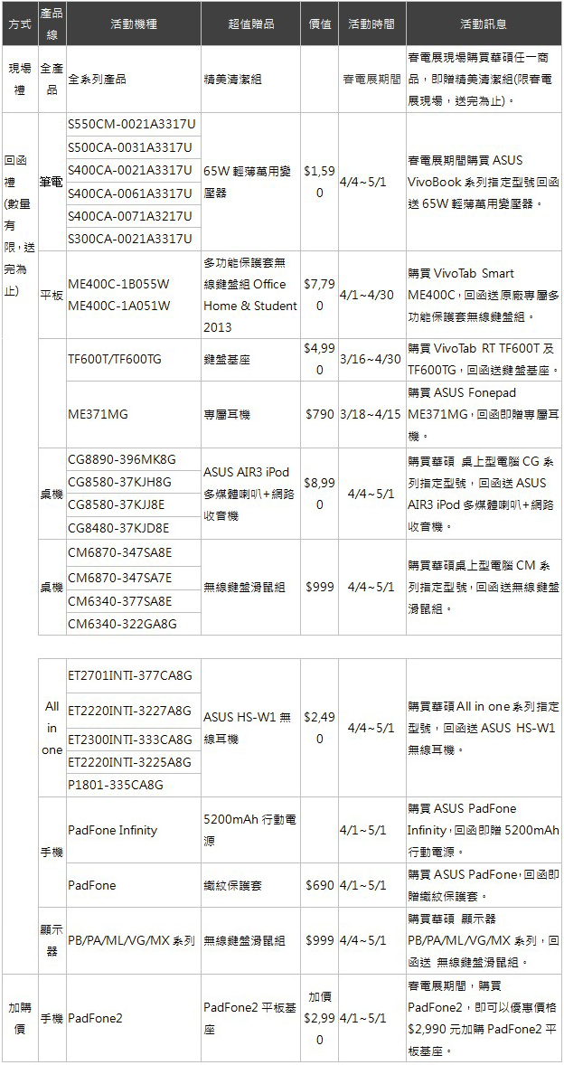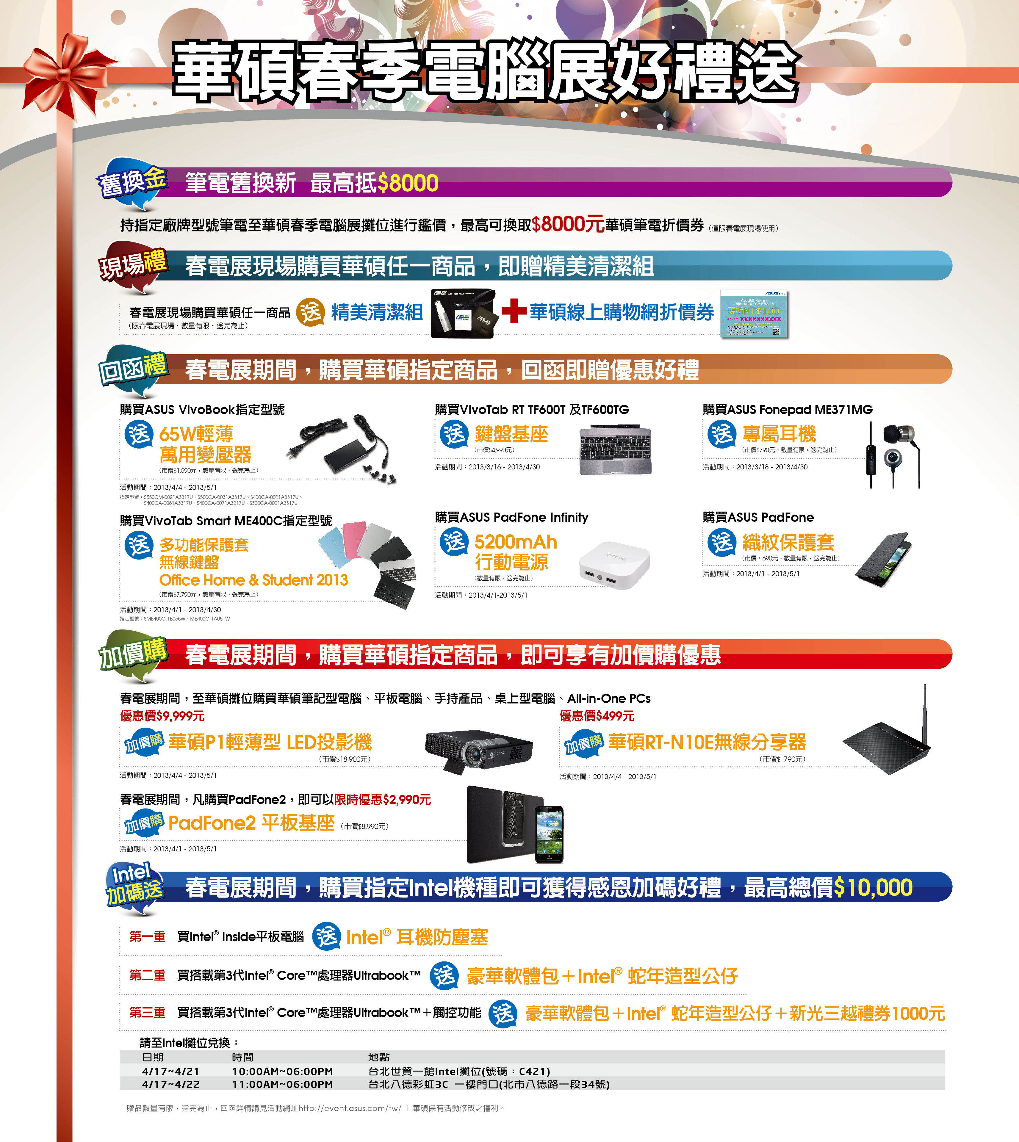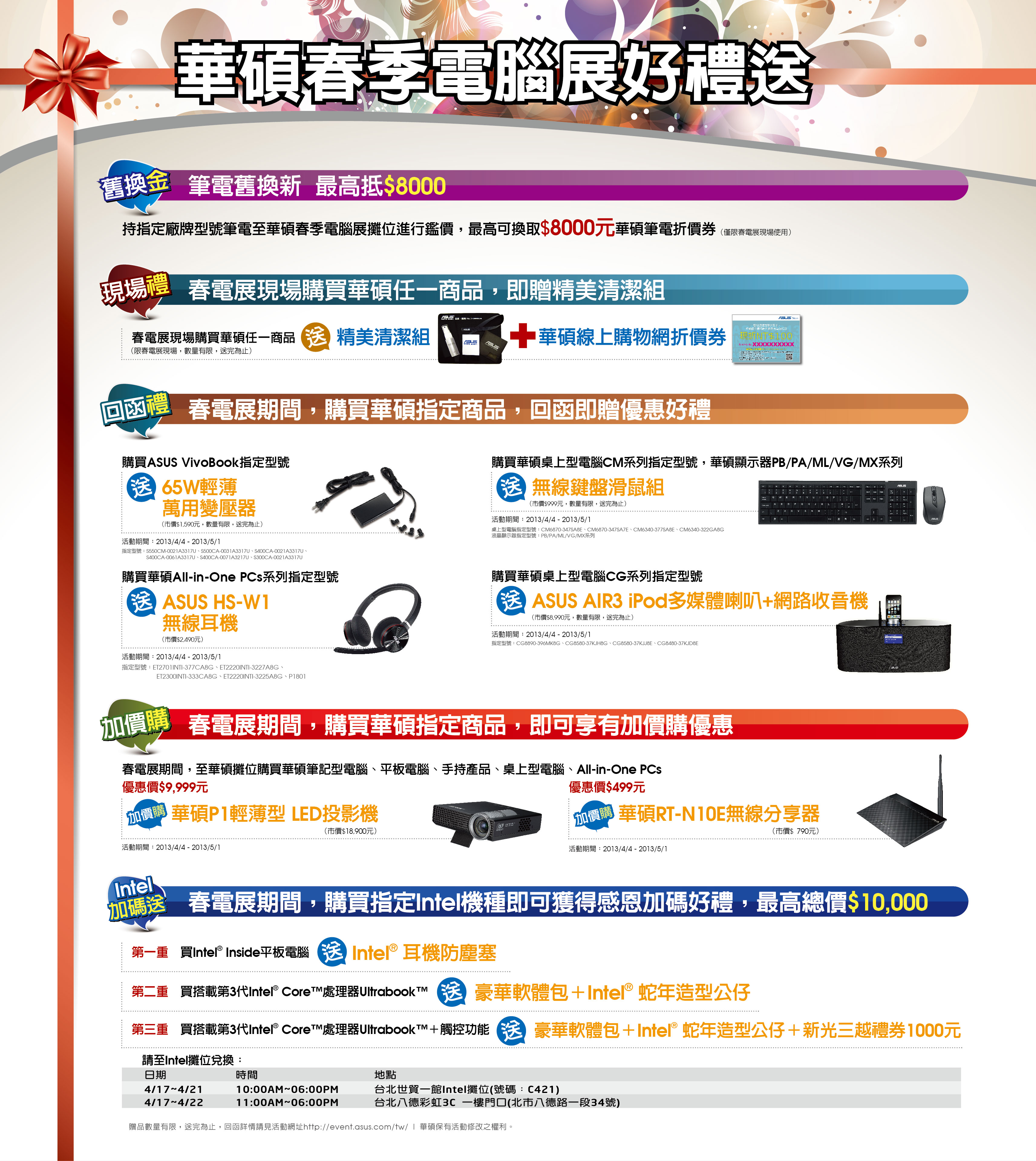華碩於 2013 年春季電腦展中,除了全新開賣的 ASUS Transformer Book TX300 變形筆電,單機售價 46,900 元起,也展出了 ASUS PadFone Infinity 變形手機、MeMo Pad ME172 與 MeMo Pad Smart ME301T 平板電腦的桃紅色版本。此外,華碩也針對多款新品,推出多重贈品優惠,買就送多項週邊、加價購優惠與商品折扣價。此外,華碩也於 2013 春電展期間推出筆電舊換新活動,持指定廠牌型號筆電至華碩攤位鑑價,最高可兌換 8,000 元華碩筆電折價券,消費者可持折價券於 2013 春電展攤位憑券折抵購買華碩筆電。另外,至華碩企業用戶專區填問卷、換名片,即贈送限量 50GB 雲端空間,ASUS「揪出外星人」活動亦同步上線,只要進入