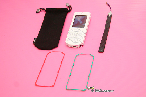包裝盒內除了附贈三條細色條之外,盒裝內附贈消費者一條手機吊飾與一個絨布手機套,手機吊飾上亦佈滿著菱形的線條圖騰,與手機外觀設計上所要呈現的主題非常搭配。