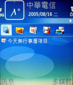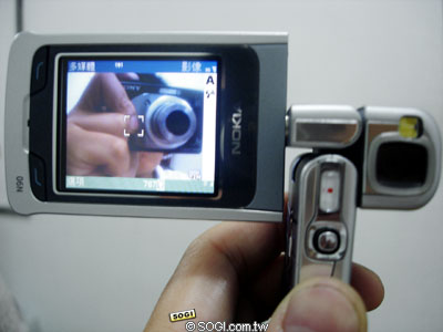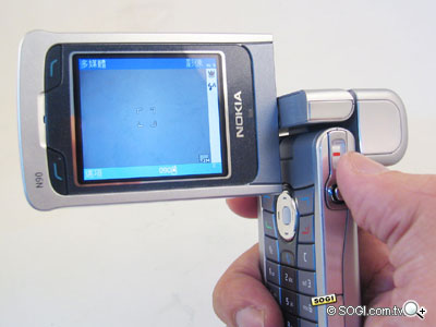 Nokia N90 在頂級相機和螢幕的光環之下,也許有人忽略了 N90 也是一款 3G 手機。小編在台北信義商圈裡,使用 Nokia N90 與手機王的編輯進行視訊通話測試,她正位於台北市區中,在時速達 70 公里的車上,以 Sony Ericsson K600i 和小編進行雙向視訊電話。Nokia N90 進行視訊通話的方式,必須是圖中的角度,將螢幕和鏡頭都轉向自己,通話的過程影像流暢,聲音也相當清晰。而 N90 在補光燈的補強之下,在灰暗的室內環境當中,對方也能看清楚自己的影像。