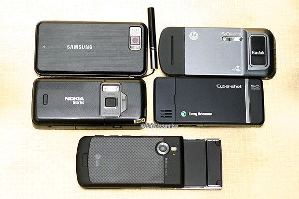 手機內建的數位相機功能,每年在規格上都會有穩定的發展,成為手機汰舊換新的重要規格之一。自去年底起,各品牌陸續推出 500 萬畫素手機,五大品牌除了 MOTO 尚未在台灣推出之外,其他四家都已經有兩款以上,其中以 Samsung 和 Nokia 最積極,這個月各有五款手機在市面上可購得,包括 Samsung G608、G808、U908、F488、i908 和 Nokia N95、N82、N95 8GB、6220 classic、N96 等。且價格上不斷趨於平價化,最低只要不到 9,000 元就能買到 LG 的 KC550。