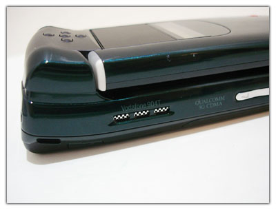 機身另一邊為 miniSD 卡的插槽,最大支援到 1GB 的程度,而手機近底部的有個相機的快捷鍵,不同的是,由於 904T 已經設計的 Grip Style 的操作系統,所以能夠透過螢幕周邊的軟鍵控制拍照參數等等,因此手機的側邊便減消不必要的按鍵,使的機身的設計顯的乾淨俐落。手機的背面搭載 320 萬畫素的 MOS 相機,可惜的是 904T 不支援自動對焦的功能,在近拍遠拍之前,必須手動調整焦距,是這支手機的唯一缺憾,如同 904SH 在相機的旁邊內建了電子錢包 FeliCa 的非接觸晶片的天線, 904T 的 FeliCa 晶片不支援 JR 的 mobile Suica 系統,當然這個服務台灣也是無法使用的。