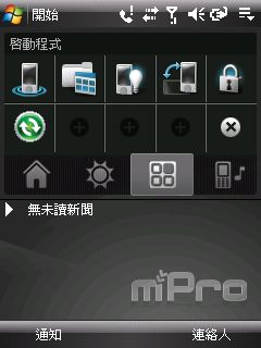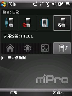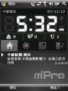 除了 TouchFLO 之外,HTC 獨有的 HTC Home 首頁介面,也是有別於其他品牌 Windows Mobile Phone 的獨家介面,提供了天氣預報、超大時間顯示、快捷程式開啟、鈴聲切換等功能。