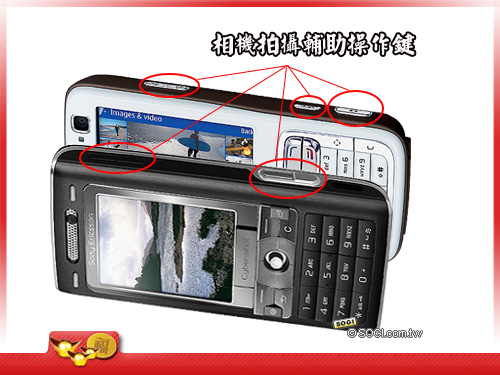 除了採用雙面設計之外,這二款照相手機為了使橫向拍攝更加符合人體工學設計,皆在機身側邊處設計了幾道相機拍攝輔助快捷鍵,除了機身側邊之外,SE K800i 還特別在螢幕上方左右兩側分別多設計了二顆快捷鍵,以操作來說,SE K800i 似乎比較多元化。