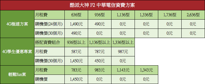 酷派大神 F2 中華電信資費方案: