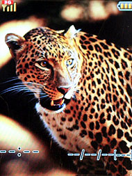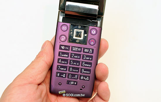 2.4 吋的螢幕周圍以紫色、黑色小格紋包覆,螢幕上方的 11 萬畫素鏡頭可作為視訊通話用。