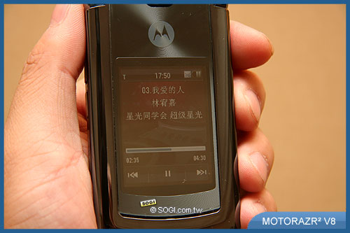 RAZR² V8 支援 MP3、AAC、AAC+ 音樂格式播放,可與微軟 Windows Media Player 11 輕鬆同步,只需短短的幾分鐘時間,即可同步將電腦中的歌曲庫傳輸到 V8 上。 可經由藍牙無線技術播放音樂,並支援 A2DP 立體聲藍牙耳機,輕鬆聆聽無線音樂。而 V8 不支援記憶卡擴充,僅內建 420MB 的動態記憶體,則是令人感到惋惜。