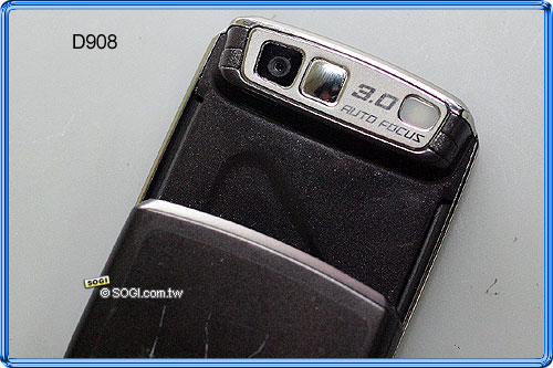 D908 的 300 萬畫素相機鏡頭設於螢幕後方,需滑開外蓋才能使用,鏡頭旁邊為自拍鏡與閃光燈。