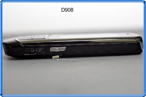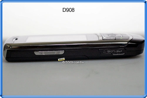 再來看看 D908 左右兩側機身,右側設有「攝錄快捷鍵」與「充電/耳機/USB 傳輸埠」,左側則為「音量調節鍵」與「microSD 記憶卡插槽」,最高可擴充至 1GB。
