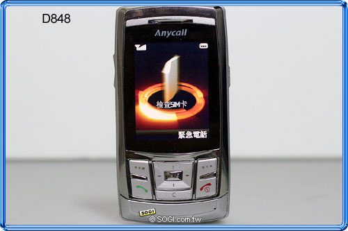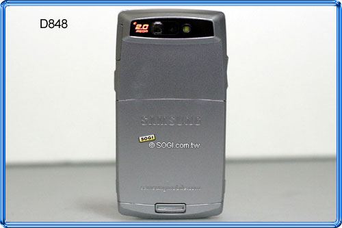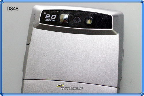 具備 200 萬拍照實力的 D848,將鏡頭設置於機身背面,不需滑蓋即可進行攝錄動作,另設有閃光燈及自拍鏡。