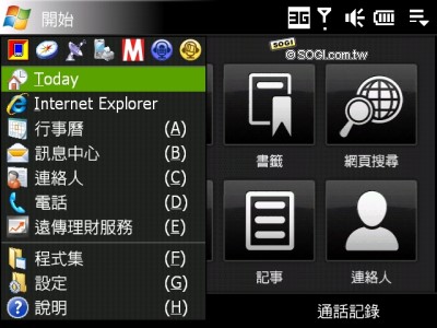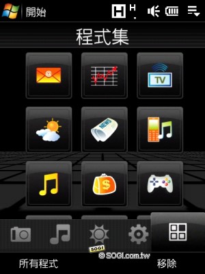 除了原本的 TouchFLO 3D 介面,因為 Touch Pro 內建 QWERTY 鍵盤,所以當推開側滑上蓋時,螢幕顯示便會自動打橫,畫面會顯示 8 個快捷圖示,可以直接點選進入功能中利用鍵盤編輯資訊,而原本 TouchFLO 介面的大圖示開始功能表顯示範圍,則會隨畫面橫置而有所縮減。