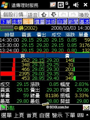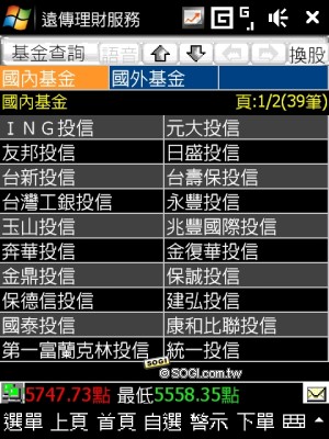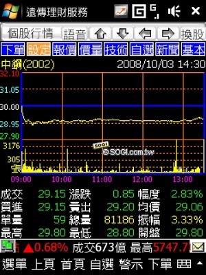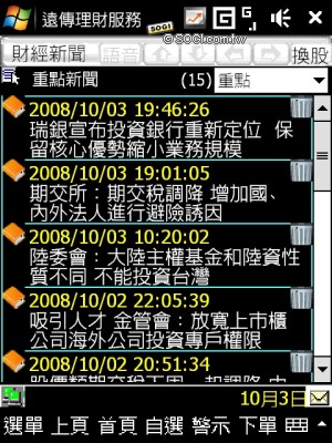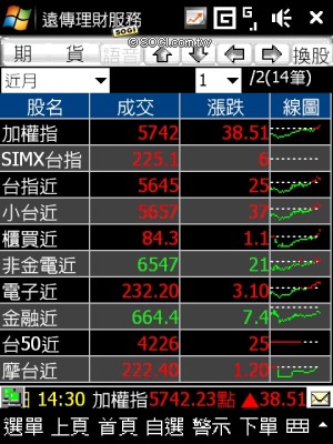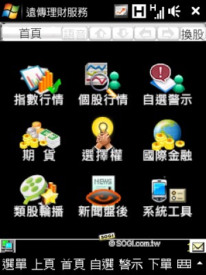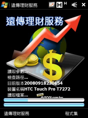 遠傳客製化的另外一個特點,就是針對商務人士設計的遠傳理財服務,HTC 將捷徑設在 Today 首頁的左快捷鍵中,透過行動網路,使用者可以隨時查看理財資訊,包含股市、匯市、基金等功能,都能由此進行下單動作(使用者必須已有股匯市交易帳號),詳細的資料及訊息讓使用者不用再透過電腦或是進到號子,只要一支手機就能搞定。