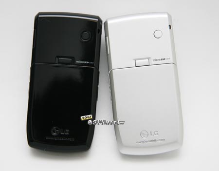 背面則是代表著可以擴充記憶卡的「Micro SD」圖示,200 萬畫素的鏡頭及 LED 補光燈。KE500 的電池及電池蓋為一體的,代表著如須添購備用的電池,需購買其專屬規格,無法與其他 LG 系列手機共用。 Micro SD 需移除電池後才可裝卸,頗為不便。