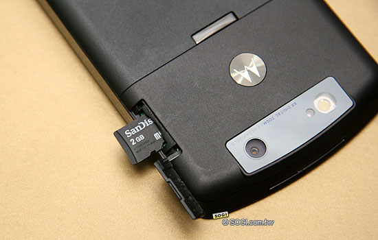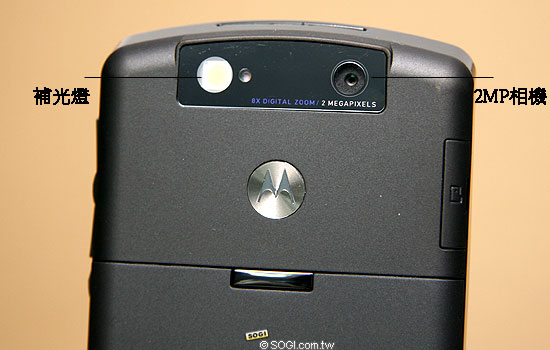 內建 MOTO 萬年不變的 200 萬畫素相機規格,按下 QWERTY 鍵最下面一排的相機快捷鍵,可以直接進入全螢幕預覽畫面,此時再按下左對應鍵,螢幕預覽便會縮小,出現相機功能的相關選單。拍照的話,直接按下五方向鍵就可以拍攝。