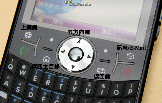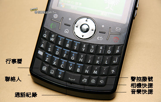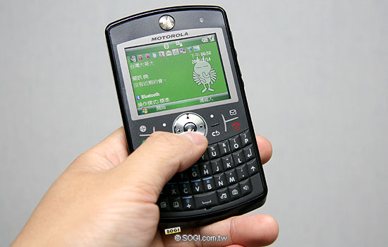 這種外型的手機,通常都會變成兩極化的反應,喜歡的就覺得好用,不喜歡的就會覺得沒事這麼多按鍵幹麻!然而 Q9h 的體積確實不小,若只是要瀏覽功能選單,用單手操作方向鍵、返回等還可以,要輸入文字的話就非得雙手並用才行了,如果習慣了它用手機打 MSN 真的滿方便的。另外,本次的借測機並非正式上市版,上面沒有印注音符號,正確版請參考 MOTO Q9h 超薄智慧機 專攻通訊達人