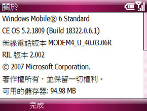 採用 Windows Mobile 6.0 Standard 系統之外,處理器為 TI OMAP 2420,RAM 為 96MB、RAM 為256MB、可用記憶體則是 120MB,還算是符合目前主流的水準。