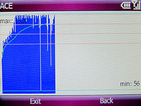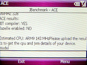 ARM 與 JBenchmark 合作開發的測試程式「ARM CPU Estimator(ACE)」,可測試手機的處理器與 Java 效能,以及 CPU 資訊以及圖表。測試的方法非常簡單,只要將 ACE 程式傳到手機或記憶卡當中,打開程式在手機上安裝即可。安裝完成後,打開 ACE 應用程式檔案並執行,即可就可以看到如 CPU Family、時脈與 Java 效能圖表等資訊。結果顯示,MOTO Q9h 屬於 ARM9 系列,執行時脈為 143MHz,支援 JIT 軟體 Java 加速,不支援 Jazelle 硬體 Java 加速。
