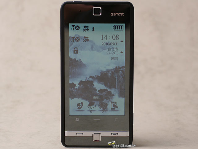 ▲GIGABYTE GSmart S1205 在正面設計有上下呼應,上為聽筒及喇叭孔;下為手機功能及確認鍵,前方使用全鏡面設計,可以拿來當鏡子使用。螢幕為 3.2 吋電阻式螢幕 240 x 400 解析度。