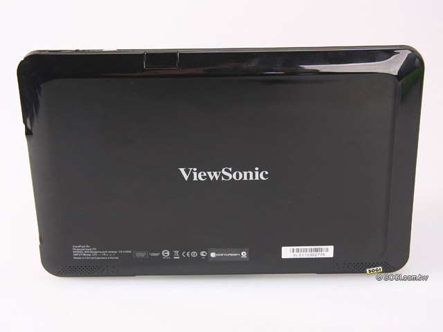 ▲ViewSonic ViewPad 10s 的背蓋為黑色鋼琴烤漆,整體質感非常優。正中央可以看到優派的 LOGO,下方有各種認證標章,最下緣則為點狀的立體聲喇叭出口。這片美背加上正面的鏡面螢幕,讓 ViewSonic ViewPad 10s 有了美觀的外型,但也註定了成為「指紋機」的命運。