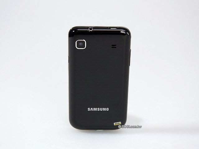 ▲接著轉到背面,左上角看到的是 500 萬畫素 AF 相機,右上為喇叭孔。下方是 SAMSUNG 的品牌 LOGO。SAMSUNG GALAXY S i9003 的背蓋並不是純黑,而是佈滿了灰色小點點,這樣的搭配,讓背面的設計穩重中又帶些活潑。