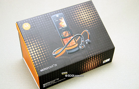 相隔將近半年,代表 MOTO 音樂手機的 ROKR 系列,繼 E2 和 E6 之後,終於推出了新一代的 ROKR Z6。比較起先前兩款,最大的不同當然就是在外型上,Z6 是 ROKR 系列首款的滑蓋機,看來是要與 Sony Ericsson 的 Walkman 系列抗衡。MOTO 在這次 ROKR Z6 的盒裝中,附贈了無線的立體聲藍牙耳機 S9,造型比歷代更為時尚、體積更為迷你,且在配色上與 Z6 呼應,皆以橘、黑兩色做搭配。