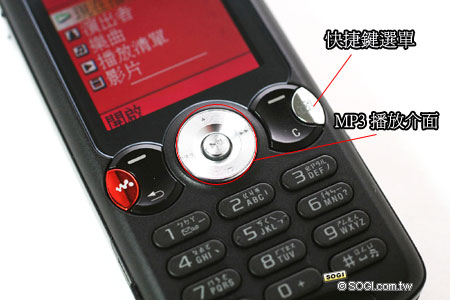 從上圖中可輕易看出,Sony Ericsson W810i 比 W800i 擁有更便利的 MP3 操作介面,不過,要立即開啟 MP3 播放功能還是要先按下橘色的 W Logo,當螢幕畫面跑出 MP3 播放器之後,使用者才能利用中間的操作介面來進行選曲與播放的功能,在平常的待機畫面下,中間的 Play 鍵僅能充當進入主功能選單螢幕的開啟鍵。