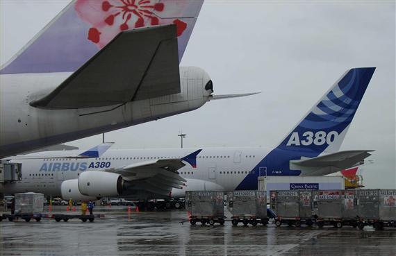 剛剛下午 3 點 50 分左右,現今世界最大商用客機 AIRBUS A380 降落在桃園機場