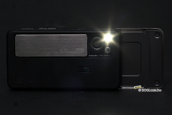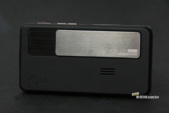 雖然機身正面中規中矩,但背面設計可就不簡單了! 仿造一般消費數位相機滑蓋即拍的設計,看起來真的很有專業級照相手機的感覺。在相機規格方面,LG KC550 採用 500 萬畫素信乃達認證專業鏡頭,手機本身還具備自動對焦與補光燈拍攝。在金屬滑動式鏡頭保護蓋下方則是 KC550 的喇叭輸出孔。