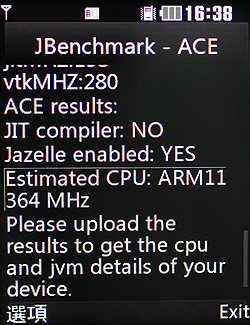 ARM 與 jbenchmark 合作開發的測試程式「ARM CPU estimator(ACE)」,可測試手機的處理器與 Java 效能,CPU 資訊以及圖表。測試的方法非常簡單,只要將 ACE 程式傳到手機或記憶卡當中,打開程式在手機上安裝即可。安裝完成後,打開 ACE 應用程式檔案並執行,即可就可以看到如 CPU Family、時脈與 Java 效能圖表等資訊。結果顯示,LG KC550 屬於 ARM11 系列,執行時脈為 364 MHz,支援 Jazelle 硬體加速。