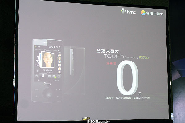註:HTC Touch Diamond P3702-一般專案:選擇搭配在地生活 968 型以上資費,並同時申辦 BlackBerry 990 型資費,手機最低只要 13,900 元。若申辦在地生活 968型以上資費,加上 catch smart 399,刷卡分期付款 12 期 0 利率,每月 1,325 元將手機帶回家。